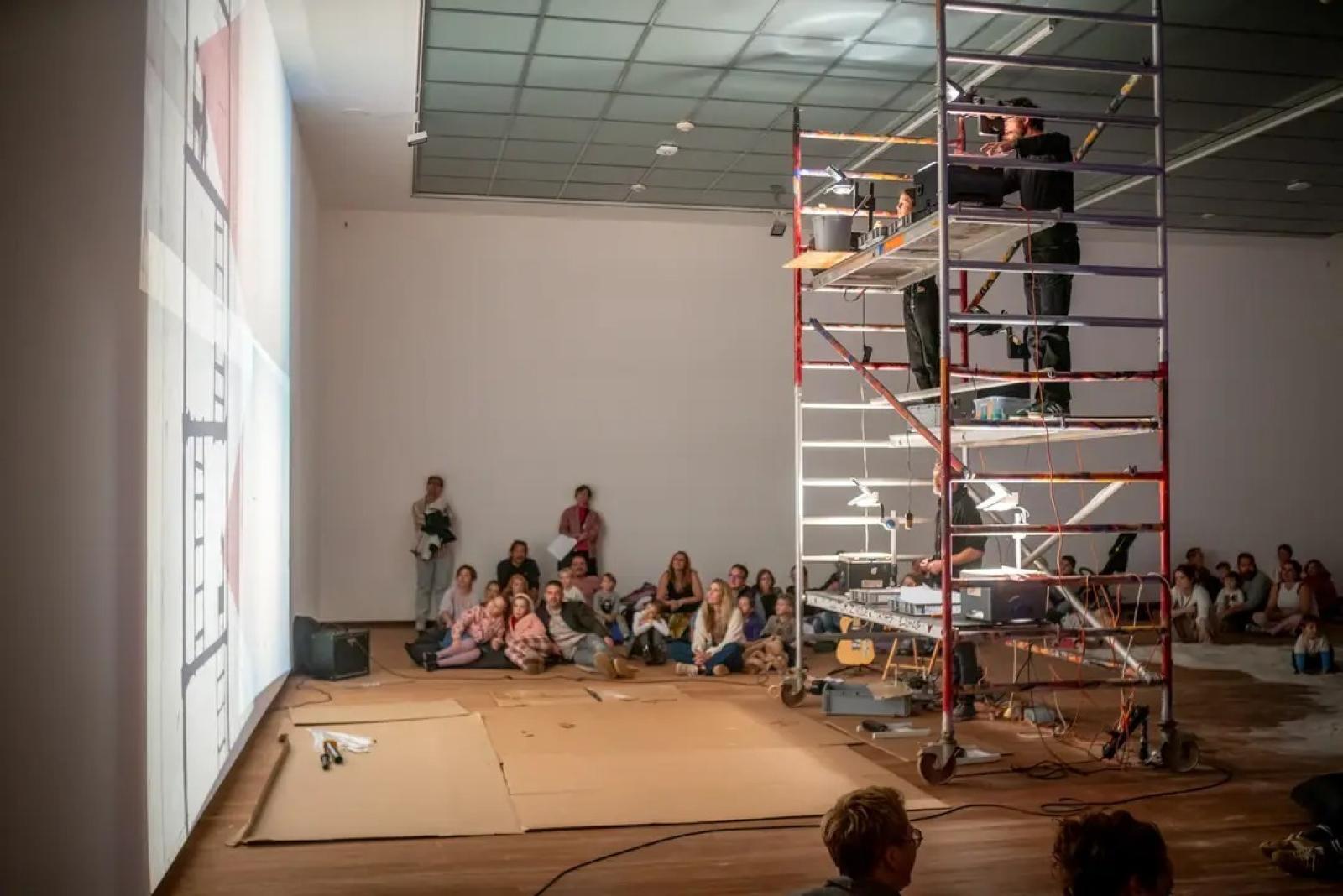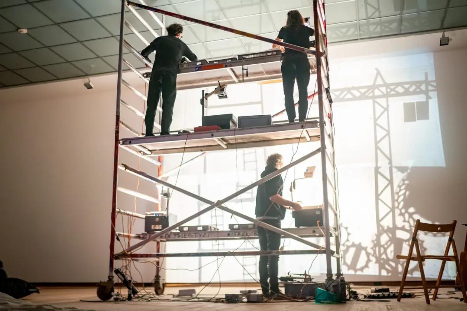 Sur un échafaudage bringuebalant, deux artisans-mécanos du rêve s’affairent dans tous les sens autour de 6 rétroprojecteurs et de guitares électriques pour une performance musicale en théâtre d’ombre, de matière et de couleur.